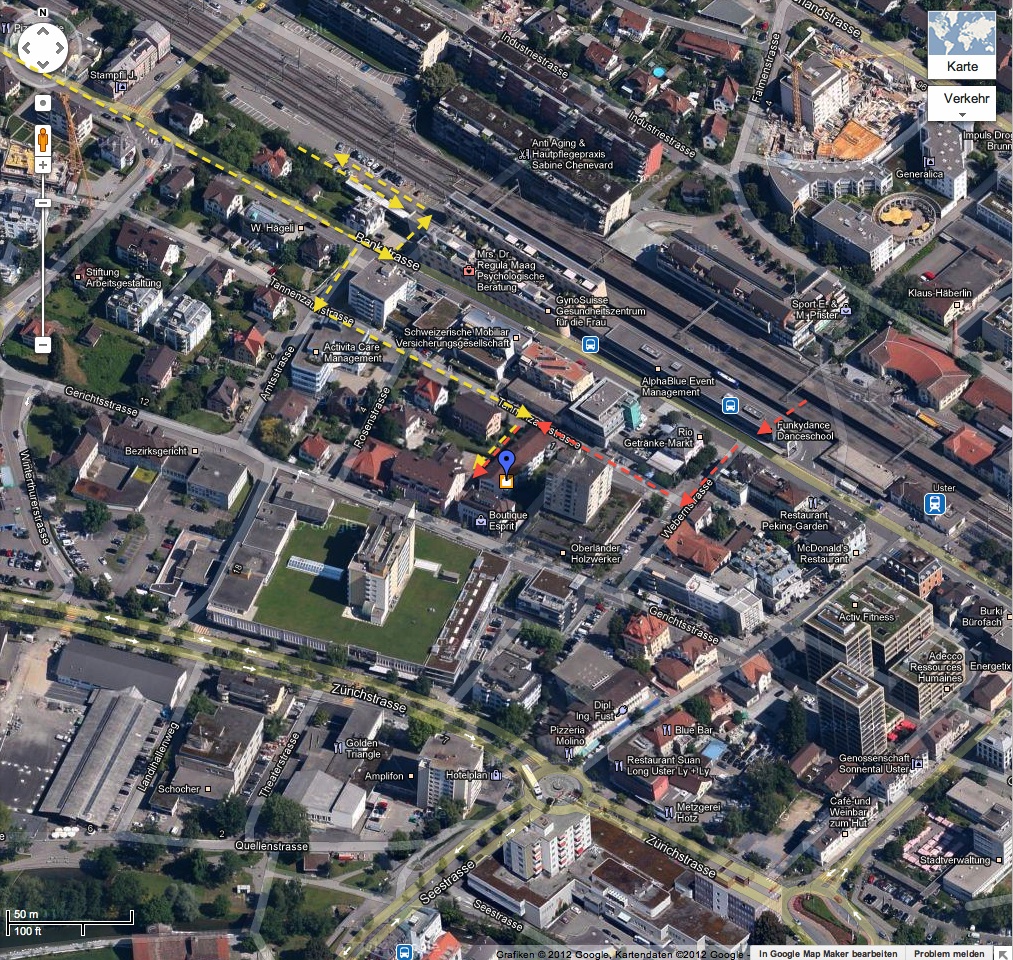 «By Car»: Center of Uster ZH near train station, (Entrance Examination West), after railroad crossing enter left to the Bankstrasse,